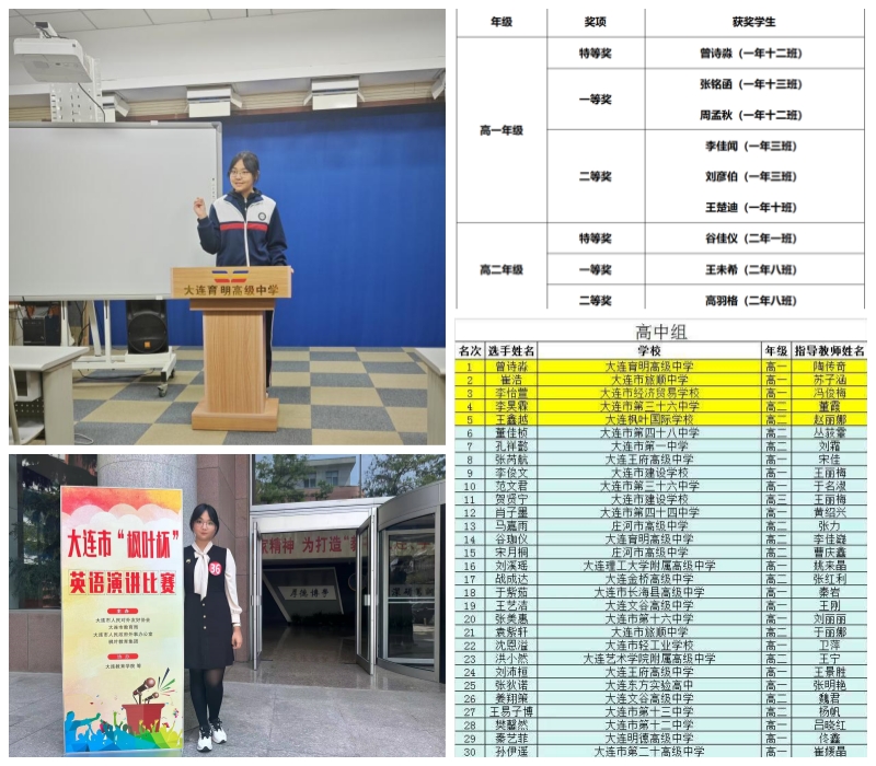 曾诗淼同学代表大连育明高级中学参与“枫叶杯”英语演讲比赛复赛,在与百余名来自各高中的优秀对手的激烈角逐下以全市第一名的成绩强势晋级决赛。
