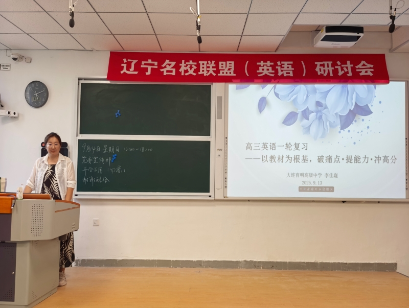 2025年9月13日,辽宁省名校联盟高三一轮复习的专题报告会在辽宁师范大学顺利举行。我校英语高三备课组长李佳嶷老师以“以教材为根基,破痛点 提能力 冲高分”为主题,结合外研社2019版教材与2025年高考英语命题趋势,为在场教师带来了一场兼具理论深度与实践指导性的教学分享。