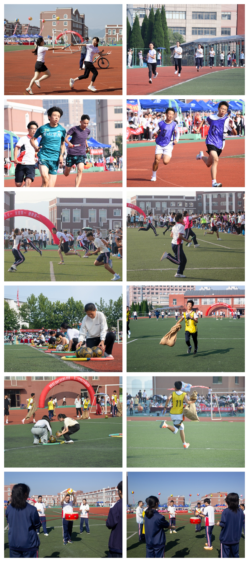 激烈比赛之余,欢笑声洋溢。丰收的喜悦、同心击鼓、跳麻袋等趣味项目,联结着师生、同学之间的默契配合。老师也登上赛场,与同学们并肩作战。一张张笑脸是友谊的具体体现,也是我们校园文化的生动表达。少年意趣,团队温暖;健儿本色,体育风采。