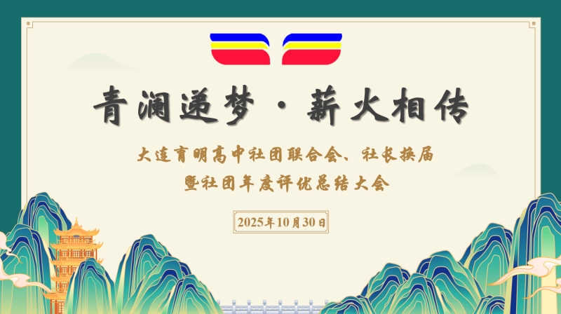 | 																														 为落实立德树人根本任务,规范学生社团管理,推动社团高质量发展,激发学生自主成长的内生动力,经学校团委统筹规划,以“青澜递梦·薪火相传”为主题的大连育明高中2025年社团联合会、社长换届暨社团年度评优总结大会于2025年10月30日在四楼阶梯教室顺利举行。