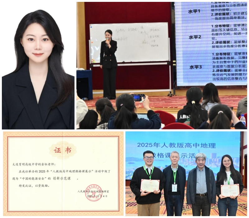 12月2日—5日,2025年人教版全国高中地理微格课展示活动在福建省厦门市圆满落幕。本次活动由人民教育出版社主办,以践行《普通高中地理课程标准(2017年版2020年修订)》理念、提升地理课堂教学质量为核心,旨在展现高中地理课堂改革的前沿实践成果。汇聚全国各省级行政区48名优秀地理教师代表同台竞技。我校金钰老师作为辽宁省高中地理学科代表,凭借《中国的能源安全》一课荣获赛事最高荣誉——“创新示范课”称号,指导教师于雁冰老师同步获评“优秀指导教师”。