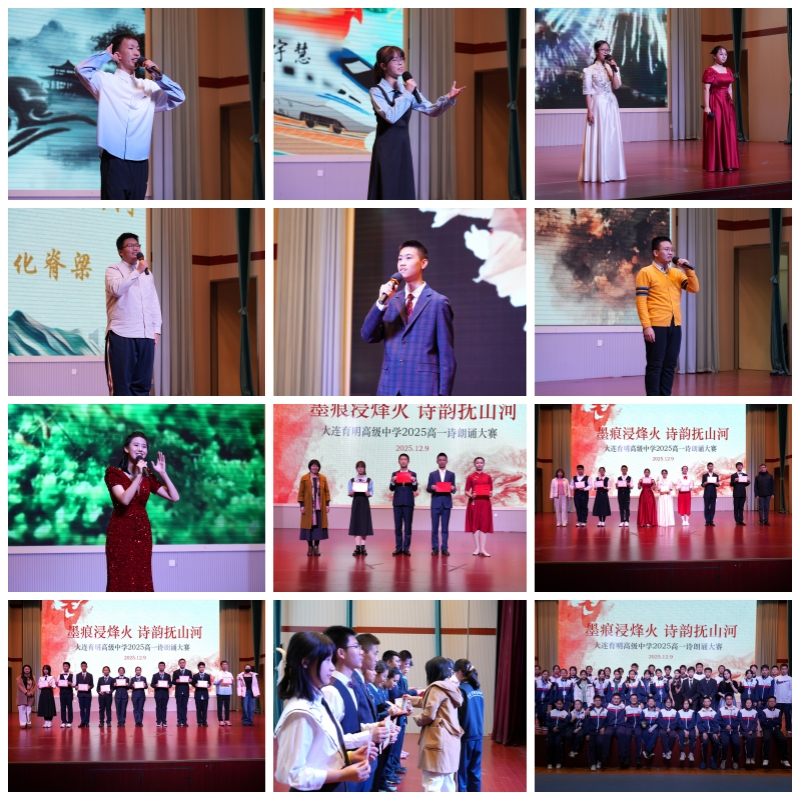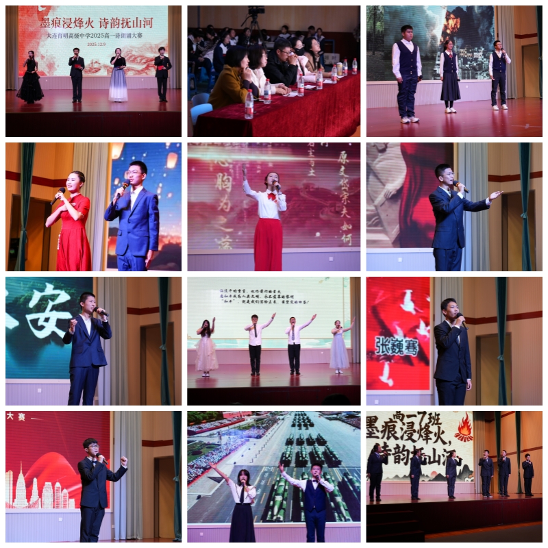 | 为传承红色基因,弘扬中华优秀传统文化,厚植新时代青年的家国情怀,2025年12月2日,大连育明高级中学高一年级“墨痕浸烽火 诗韵抚山河”主题诗朗诵大赛温情启幕。高一学子以声为媒、以情为笔,用铿锵语调串联峥嵘岁月,用真挚情感诠释使命担当,为全场师生呈现了一场兼具思想深度、艺术美感与精神力量的文化盛宴,让诗意与信仰在校园久久回荡。