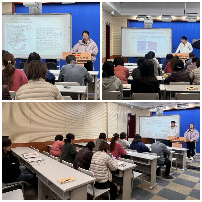 | 为深化文科领域跨学科融合,推动语言教学与历史文化同向同行,引导师生在经典文脉中涵养精神品格,2026年4月8日,大连育明高级中学英语教研组与历史教研组联合开展“烽火治学:史英双视角下的西南联大”专题跨学科教研活动。两学科教师齐聚研讨,以西南联大为共同文化载体,在交流互鉴中探索文科协同育人的新路径,为学校人文社科类跨学科教学注入新动能。