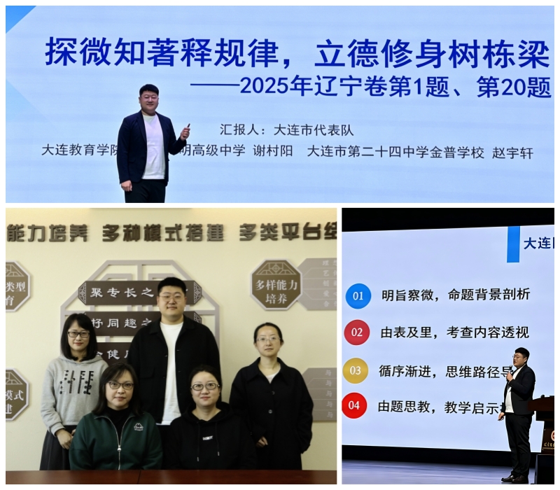 本次研讨会聚焦新课标落地、新高考备考与课堂教学提质,搭建全省历史教师交流互鉴平台,其中“说(命)高考题” 展示环节成为本次研讨会的亮点,我校青年教师谢村阳与大连市第二十四中学金普学校青年教师赵宇轩组成大连市代表队,凭借专业素养与精彩展示赢得广泛赞誉。